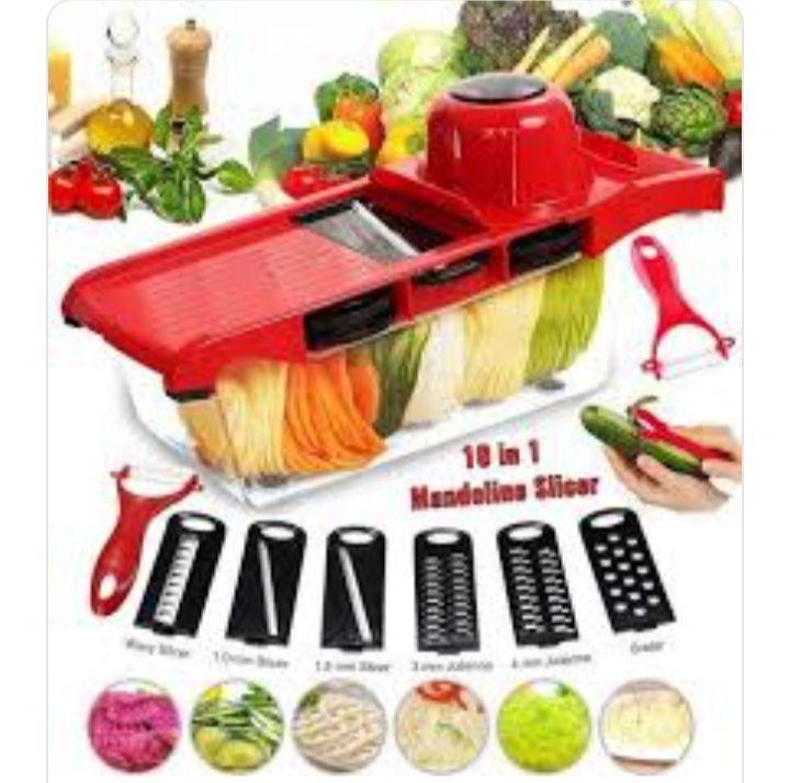 - Material: High-quality ABS plastic and stainless steel blades Color: Red (with black & transparent parts) Blades: 6 interchangeable stainless steel blades Functions: Slicing, grating, shredding, julienne cutting, peeling Capacity: Integrated container for collecting sliced food Safety Features: Hand guard and non-slip base Easy to Clean: Detachable parts, dishwasher safe