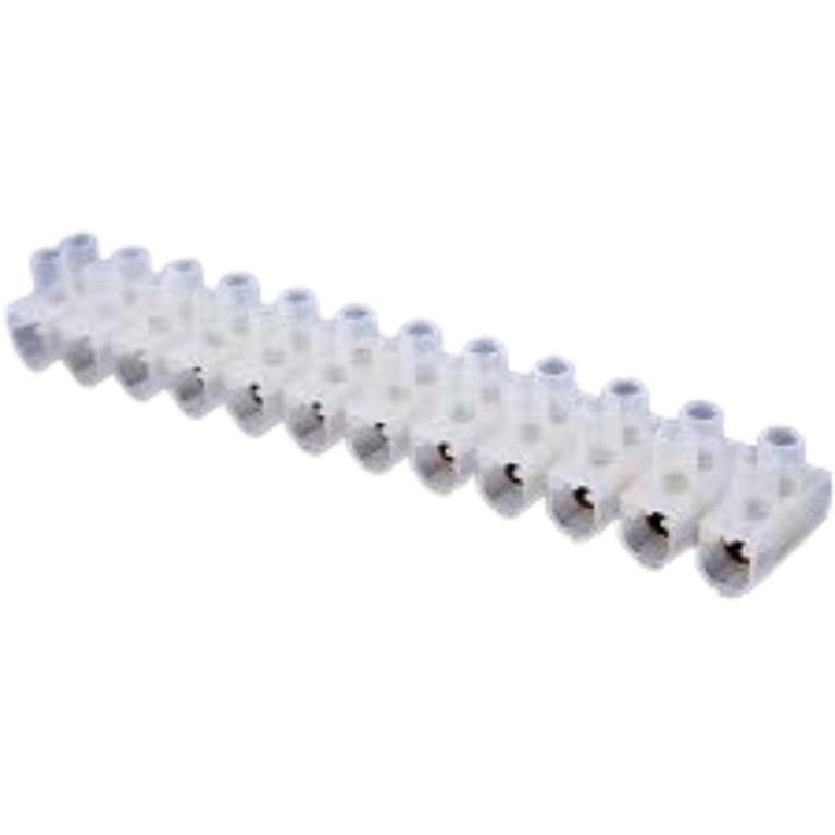 The 12-Way Wire Connector Strip features robust brass terminals encased in a sturdy plastic body. This connector strip is designed for secure and dependable electrical connections.