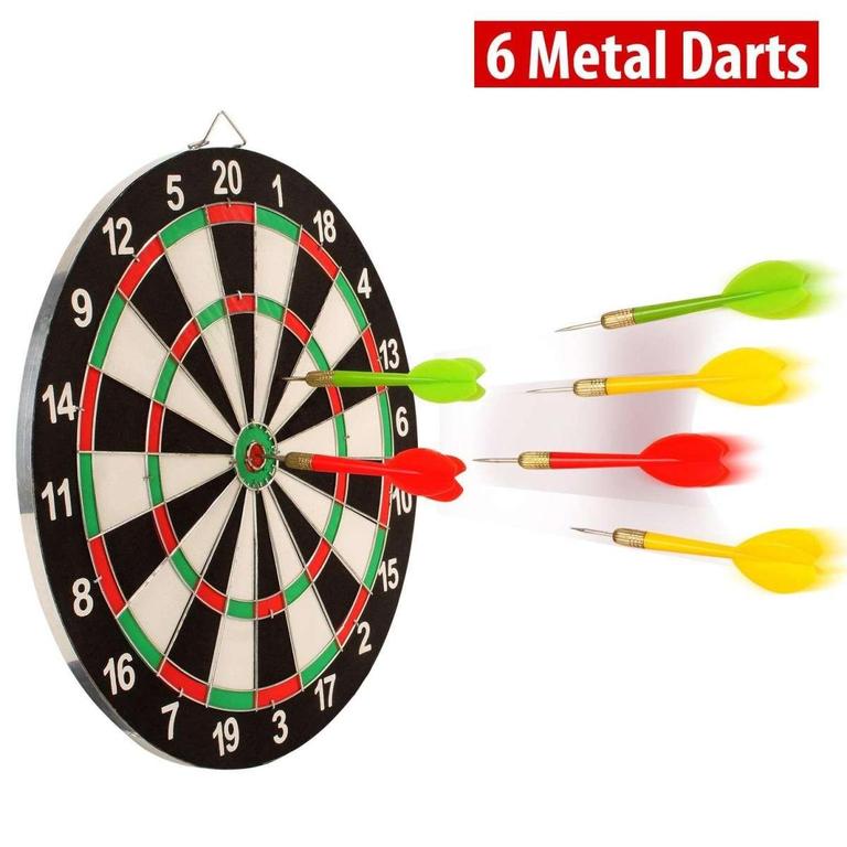 - Package Includes 12 inch Double-sided dartboard and 4 metal darts (2 red, 2 green).