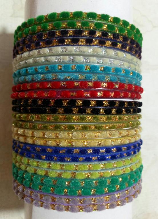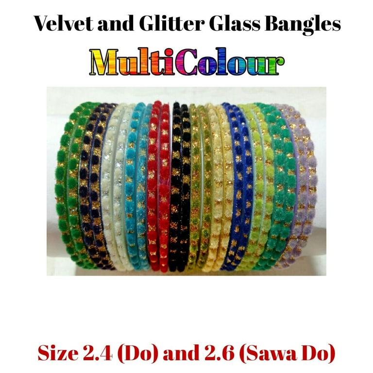 Introducing a vibrant collection of 24 multicolored Hydrabadi velvet and glass bangles.