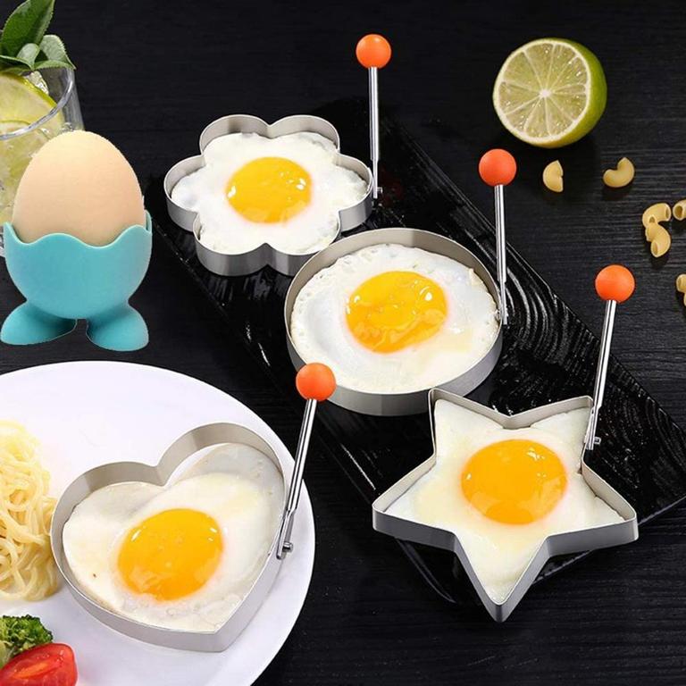 - What's Included: This set includes four uniquely shaped egg rings (Star, Heart, Round, and Plum Flower) along with one silicone egg cup holder, making it perfect for preparing delicious eggs or pancakes for family and loved ones.