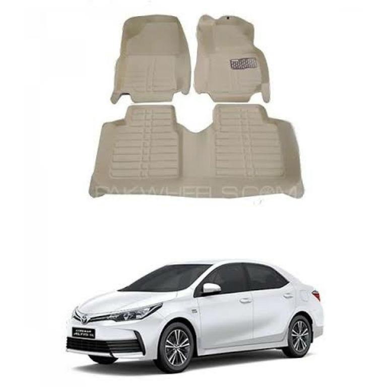 - 5-D Mat designed specifically for Corolla models from 2014 to 2020, highlighting premium quality in a beige color.