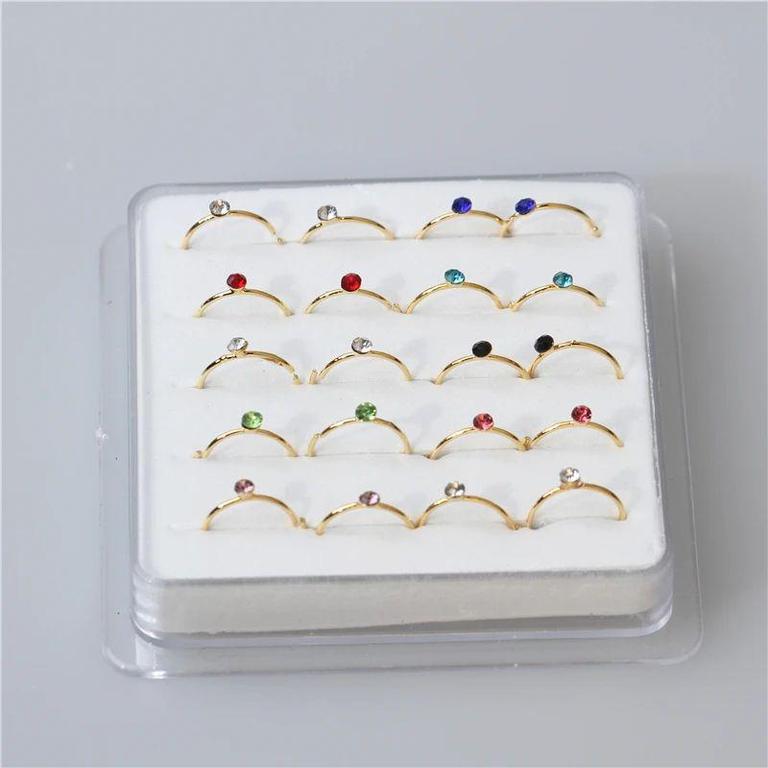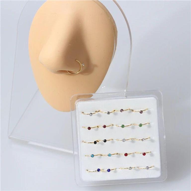 Enhance your style with this set of 5 single stone nose rings. Available in vibrant gold and multicolor, these nose cuffs are perfect for both piercing and non-piercing options.
