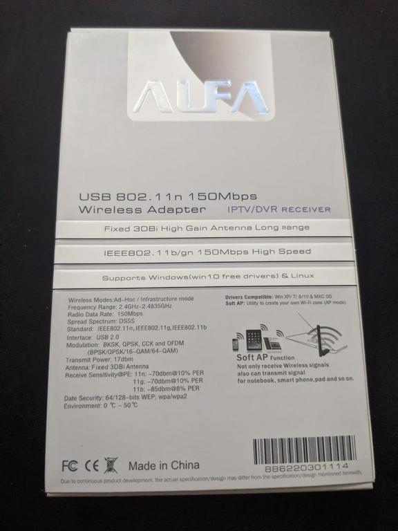 ALFA WIFI NET Wireless-N USB Adapter with Fixed 3-DBi Antenna - Soft AP WiFi