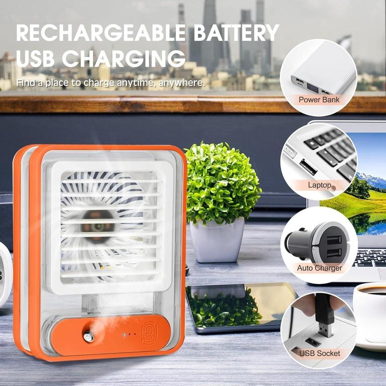 - ❄️ 2-in-1 Cooling & Mist Fan: Functions as a table fan or car fan with 360° rotation.