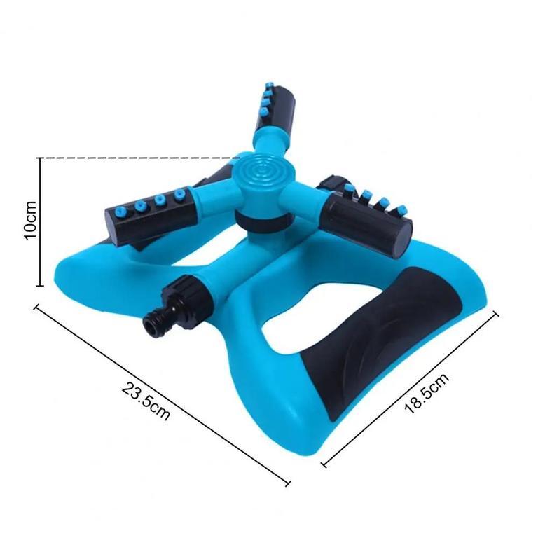 The sprinkler measures 23.5cm long, 18.5cm wide, and 10cm tall. It features three rotating arms and 12 nozzles, covering an area of up to 3600 square feet. You can customize the spray area by connecting it to your hose and adjusting the spray angle between 15 to 45 degrees.