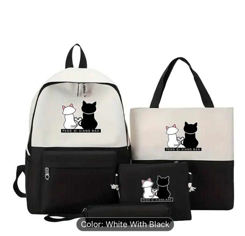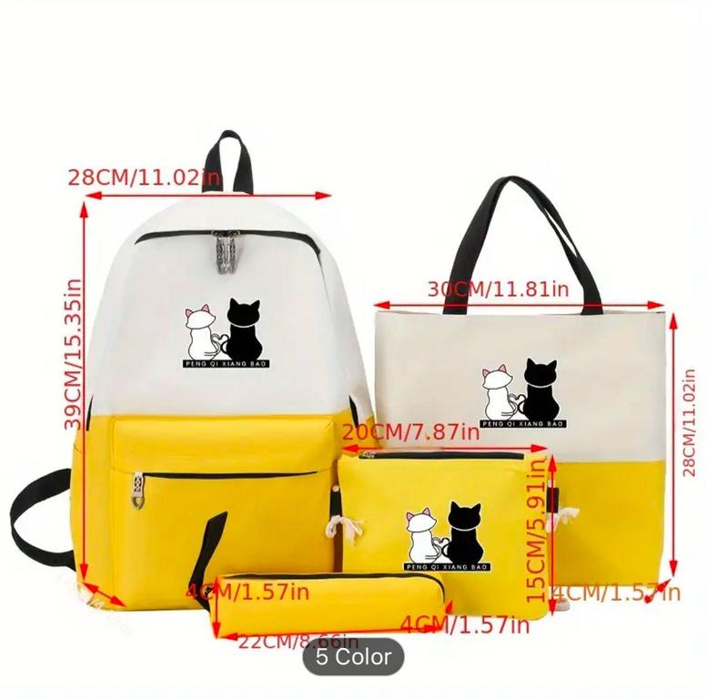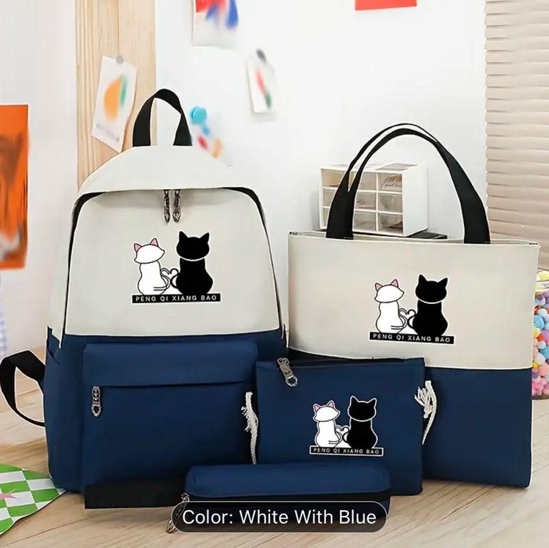 This backpack set includes four essential pieces: a main backpack, matching handbag, pencil case, and wallet.