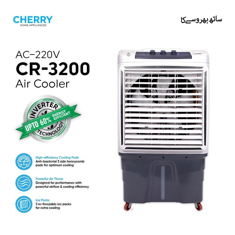 Cherry Air Cooler CR-3200 , AC-220V High Throw, Super Plus Fast Cool , 80 Liters , Auto Swing and Turbo Cooling Technology , 4 Way Movable , Ice Box Technology , 1 Year Warranty