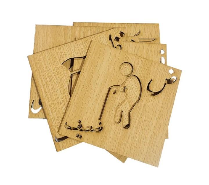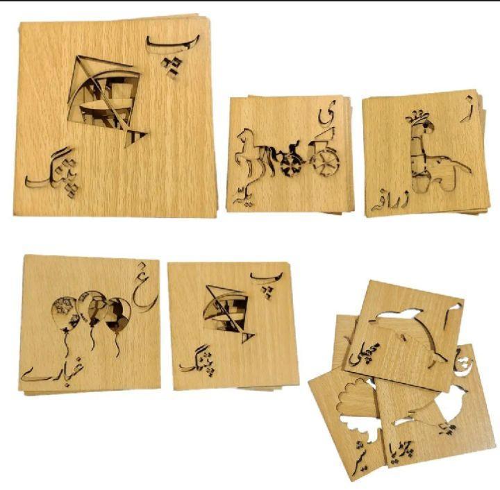 This set of Wooden Urdu Writing and Drawing Stencils is designed to help children learn Urdu letters (haroof e tahaji) through engaging activities. Each stencil features outlined pictures, making tracing fun and educational.