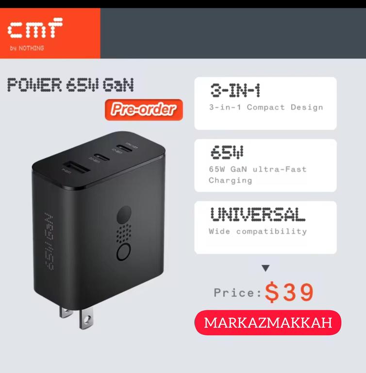 CMF by Nothing 65W Gan 3-Port Wall Charger Adapter with USB C1 65W, USB C2 45W, USB A 18W for Nothing Phone 2a/2a Plus/2/1 and Samsung S24