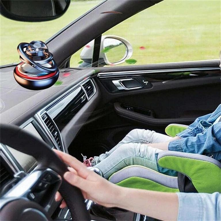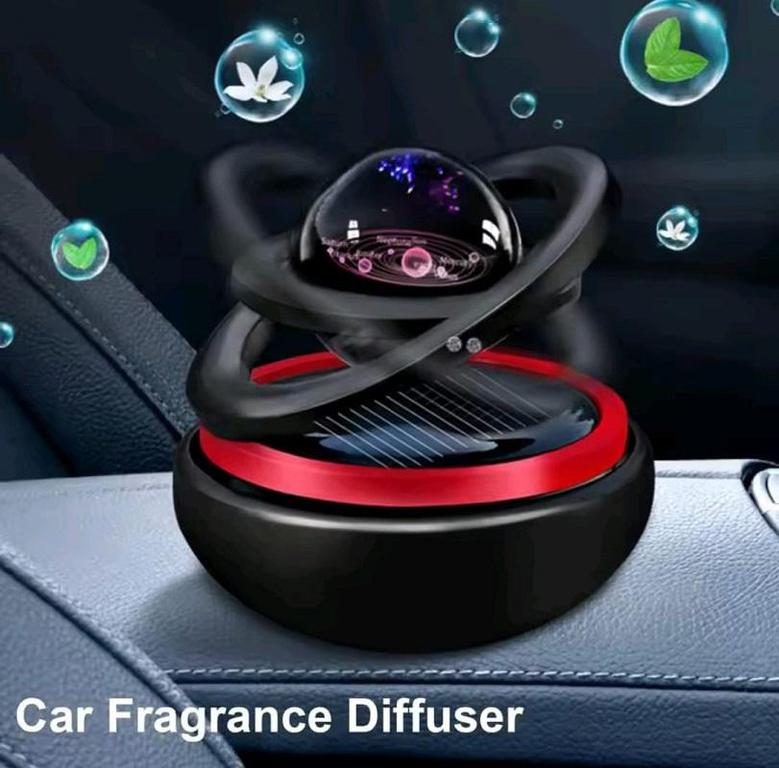 Solar-powered car air diffuser with unique interstellar rotating design, no batteries or charging required.