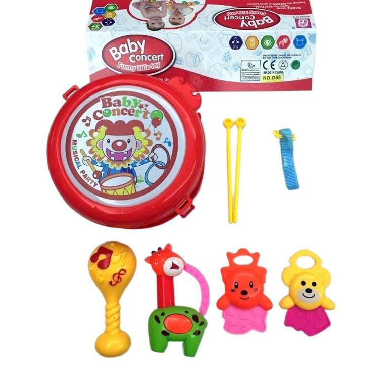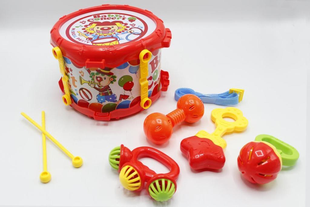 This drum set is specially designed for babies, encouraging creativity and musical exploration. It comes with a pack of four rattles and two sticks, providing everything your child needs to start their musical journey.