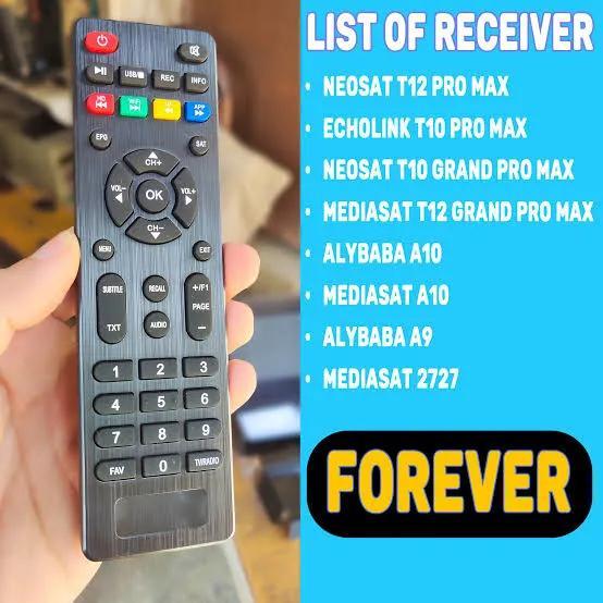 • Original Quality• Forever, FunCam Universal Remote• Compatible With All Forever Tiger Receiver• Compatible With( NeoSat T12 Pro Max,Echolink T10 Pro Max,Neosat t10 Grand Pro Max,Mediasat T12 Grand Pro Max,Alybaba A10,Mediasat A10,Alybaba A9 And Mediasat 27• Unbreakable Plastic Material Best Quality