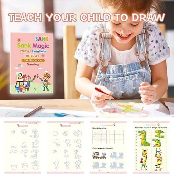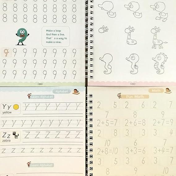 - MAGICAL REUSABLE FUNCTIONALITYThe magic practice copybook offers automatic fading and reusability. The handwriting gradually disappears after drying, making it ideal for repetitive practice, especially for beginners.4 IN 1 MAGIC PRACTICE COPYBOOKThis set includes four books covering English Letters, Numbers, Addition and Subtraction, and Drawing. It also includes a Calligraphy Pens Set, consisting of 1 Pen Holder, 4 Magic Pen Refills, and 1 Aid Pencil Grip.COMFORTABLE WRITING DESIGNThe practice copybook measures 19*13 cm and features a three-dimensional groove design. The high-quality paper ensures durability. Additionally, the soft and cute pen holder provides long-lasting comfort during writing sessions.BUILD WRITING SKILLSBy following paths and drawing various shapes with the pen, children develop their writing skills. This Calligraphy set is perfect for beginners, aiding them in practicing beautiful handwriting.