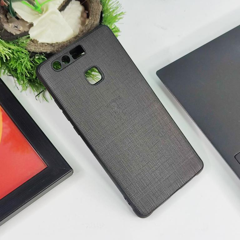 This Huawei P9 cover features a leather-like texture and is designed for shock absorption. It includes soft borders that provide a snug fit and added protection.
