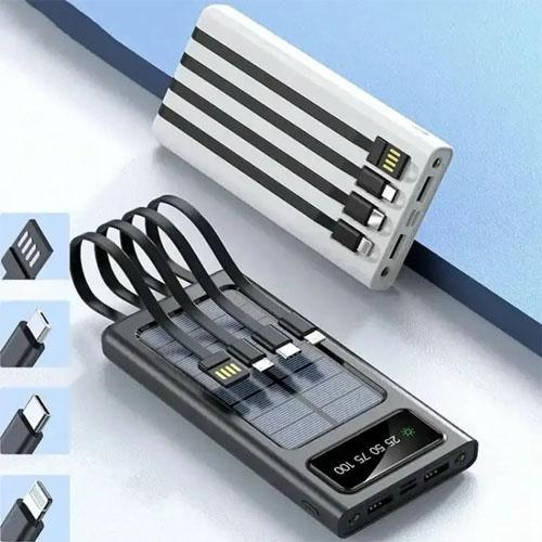 Imported Solar Power Bank 10000mAh with LED Light and 4 Built-in Cables - Portable Fast Charging