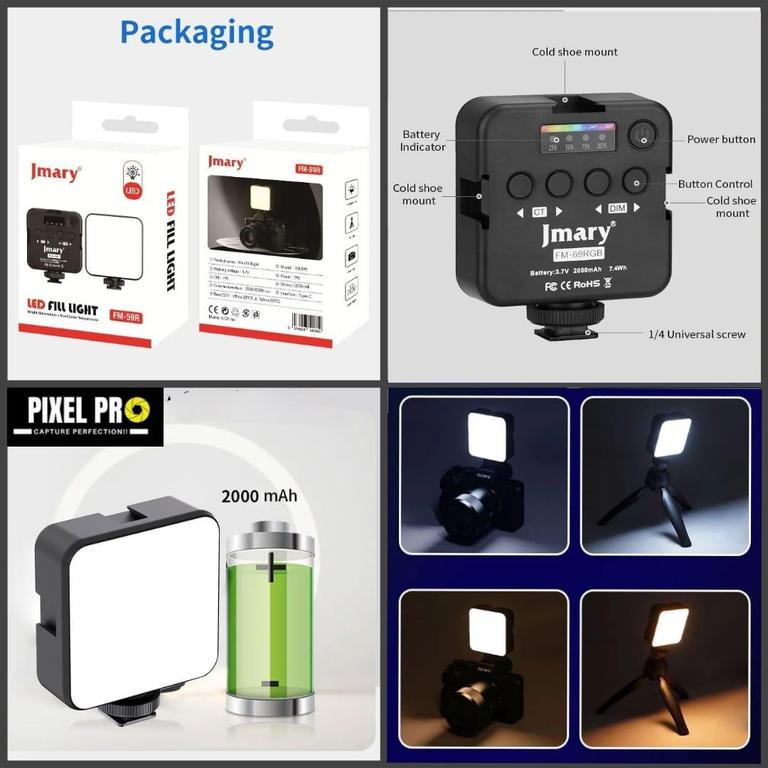 The Jmary FM-59 RGB Light is a versatile lighting solution designed for various devices, including mobile phones, cameras, and iPhones.
