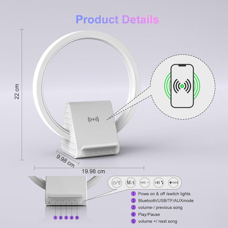 This LED Wireless Charging Speaker BT256 is a versatile device that combines a Bluetooth speaker, a bedside lamp, and a wireless charger in one. With a powerful 15W inductive charging capability, it can quickly charge your phone while you enjoy your favorite music. The speaker delivers high-quality sound with deep bass and clear treble, making it perfect for parties, outdoor activities, or just relaxing at home. The built-in lamp provides soft and warm lighting, creating a cozy atmosphere for your bedroom or living room. This speaker is easy to use and compatible with most Bluetooth-enabled devices. Whether you're listening to music, charging your phone, or reading a book, this LED Wireless Charging Speaker BT256 is a must-have for any modern home.
