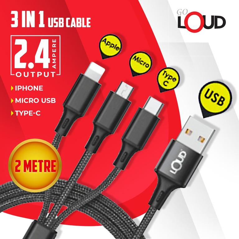 Loud C306 3-in-1 Multi Fast Charging Cable for Android, Lightning, Type-C - 1 & 2 Meters