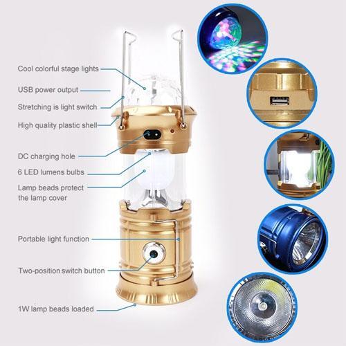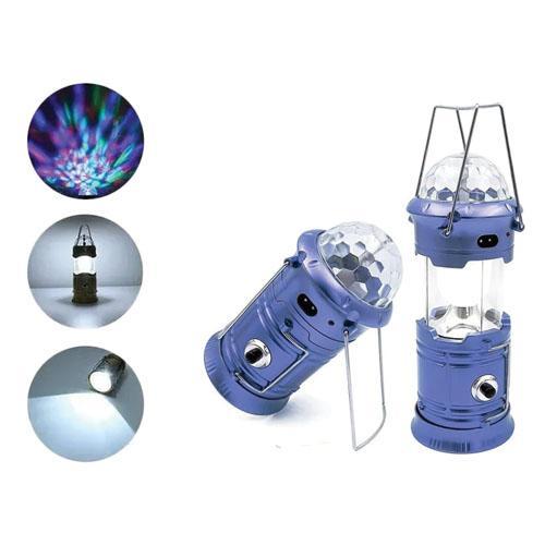 - Light Modes: 3-coloured LED magic disco lamp, 6 LED camping lamp, 1W torch