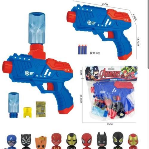 The toy is a "Nerf 2 in 1 Captain America Manual Reload Gel Blaster and Darts Toygun," characterized by its blue and red design. This captivating toy features elements associated with Captain America, like stars and stripes. The packaging showcases the "Avengers" logo and includes the phrase "SUPER HERO COLLECT THEM ALL," highlighting its connection to a series of superhero-themed toys. It is recommended for children ages 3 and up.