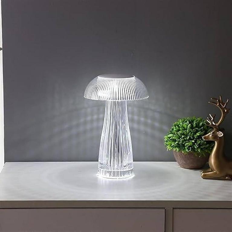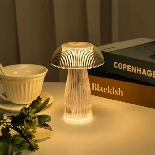 The image displays a modern and whimsical LED table lamp designed in a mushroom shape, featuring a transparent, fluted body and cap that allow light to diffuse elegantly. This rechargeable lamp boasts contemporary aesthetics, making it suitable for various settings such as bedrooms, living rooms, and offices, and often comes with touch-dimming functionality for adjustable brightness and ambiance.