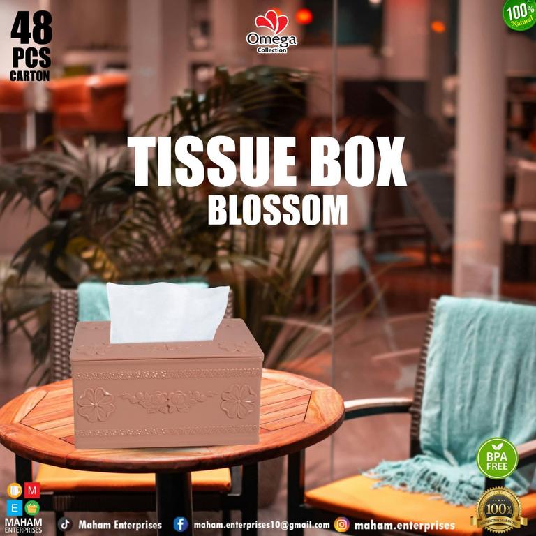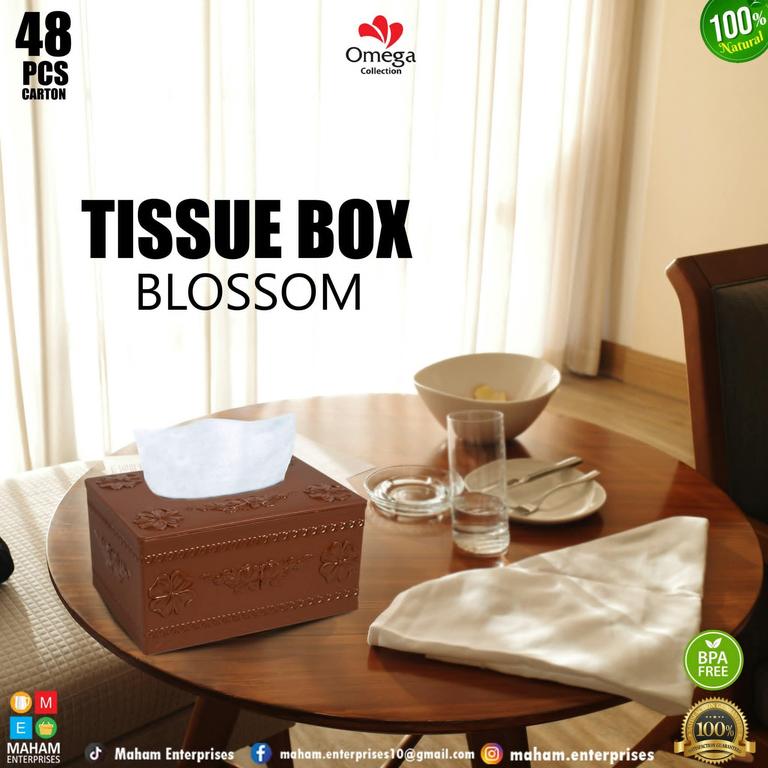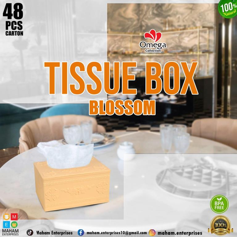 The Omega Collection Blossom Tissue Box comes in a carton of 48 pieces, making it a convenient choice for bulk users. It is recognized for its natural materials, validated by the "100% Natural" seal, and is labeled "BPA Free," catering to health-conscious customers.