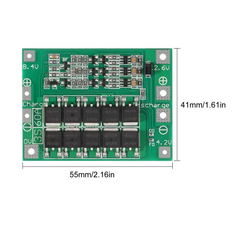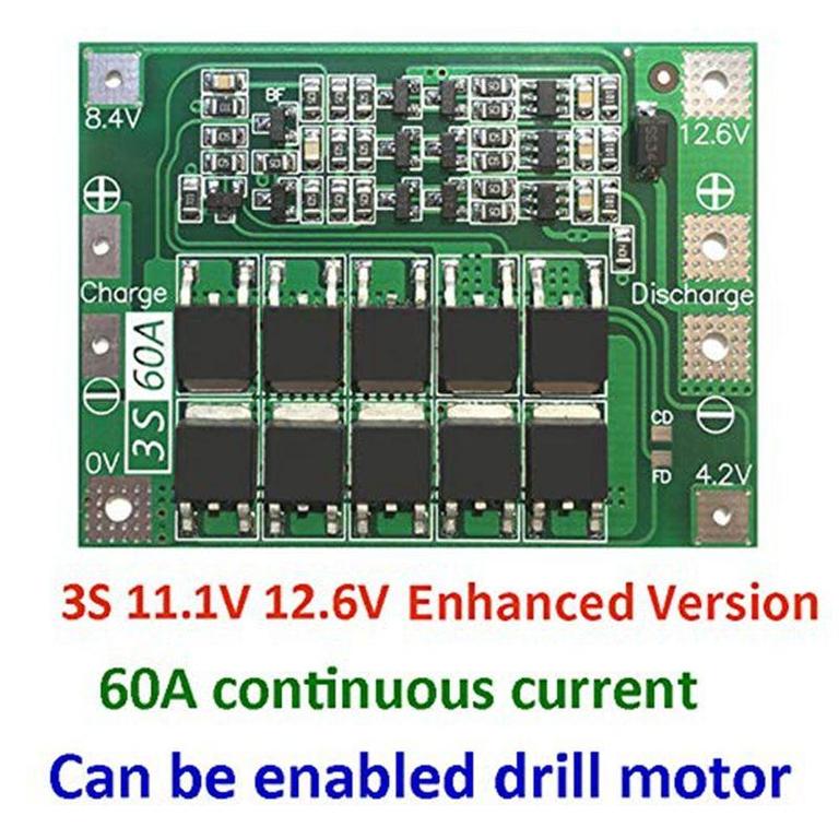 Original 3S 60A BMS 11.1V 12.6V 18650 Li-ion Lithium battery management System Enhanced Version 3S 60A BMS Module Support Drill Motor - Drill machine BMS 3S 60A 12.6V Enhanced version: Suitable for electric drills with a starting current of 120A or less and a of 260W or less. Scope of application: Suitable for lithium batteries with nominal voltage of 3.7V and full voltage of 4.2V(including 18650,26650,polymer lithium batteries,no size limit). Charge voltage: 12.6V-13.6V Continuous discharge current(upper limit):60A(If the heat dissipation environment is not good, please reduce the load current)