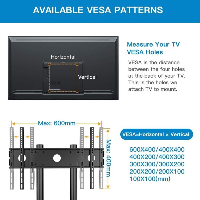 UNIVERSAL TV CART ON WHEELS: Rolling TV cart fit for most 32-65" TVs up to 132 lbs, and fits VESA 100x100 - 600x400mm mounting patterns. Not perfect? You can check other PERLESMITH TV mounts for an ideal match HEIGHT ADJUSTMENT: Customize your viewing experience by adjusting the TV plate and AV shelf. Good-sized shelf for other electronics, such as DVR DVD Bluray Players Cable Boxes Consoles Satellite XBox PS3 HUMANITY DESIGN: This TV stand comes with lockable wheels. Once unlocked, it is pretty easy to roll the TV to a different location if needed. Cable management allows you to simply organize and conceal the wires and cables in the back of the stand EASY SETUP & SPACE SAVER: TV cart with proper instruction and all included hardware in pre-labeled bags. Don’t have much space? This mobile TV cart is the best way you can roll the TV from room to room HIGHLY COMPATIBILITY: One floor TV stand meets multiple needs you can move your TV anywhere. Also perfect for commercial use in shopping malls, offices, conference rooms, trade shows, and more