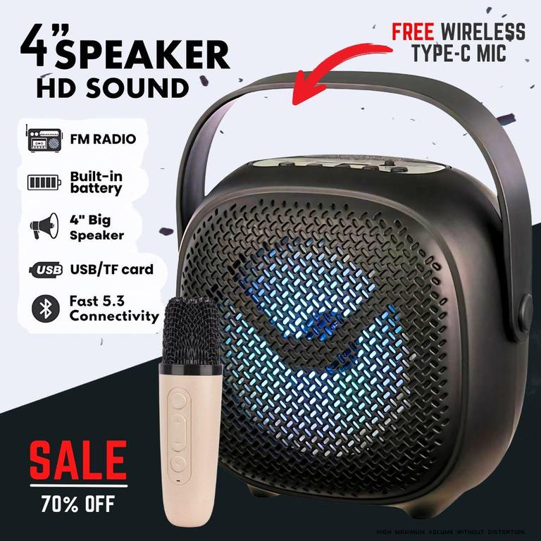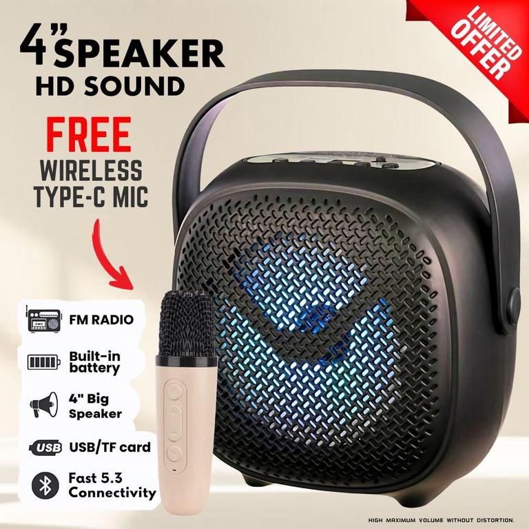 This Bluetooth Wireless Speaker delivers impressive sound quality with rich bass and a built-in woofer. It comes with a complimentary wireless microphone, making it an ideal choice for events or presentations. Its portable and rechargeable design ensures versatility, allowing it to connect with USB, SD cards, and FM radio, in addition to mobile devices, PCs, and laptops for a comprehensive audio experience.