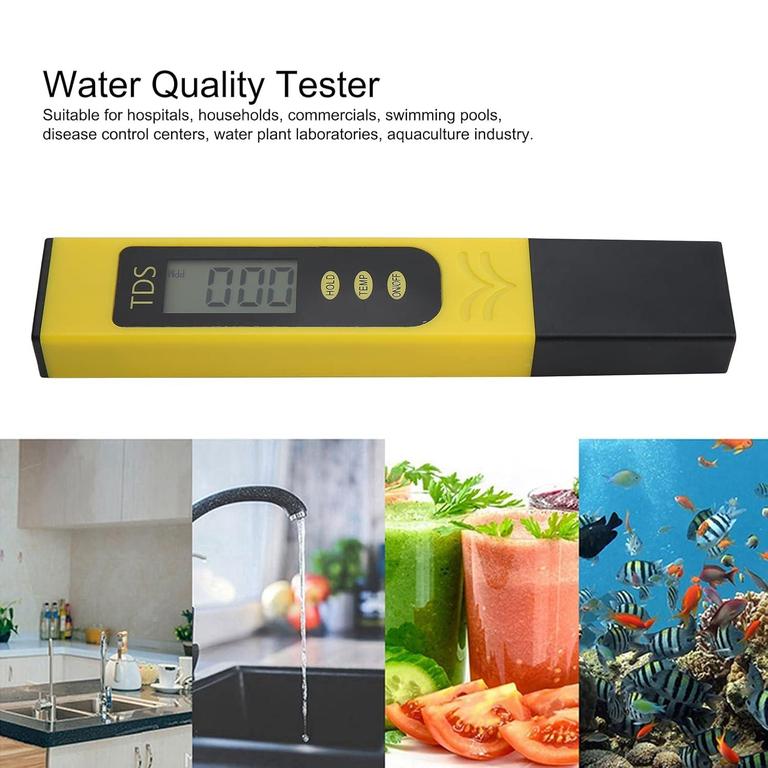 This portable TDS meter features an HD LED display and is designed for water quality testing in various environments including hospitals, swimming pools, and water treatment laboratories.
