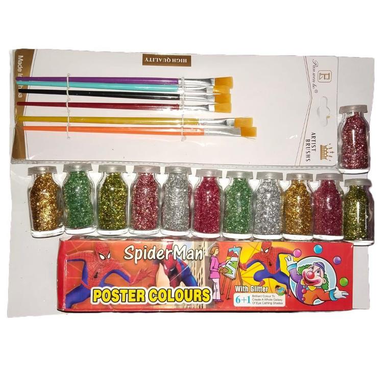 The Poster Color Set includes glitter bottles and a paint brush, designed specifically for school students and young artists.