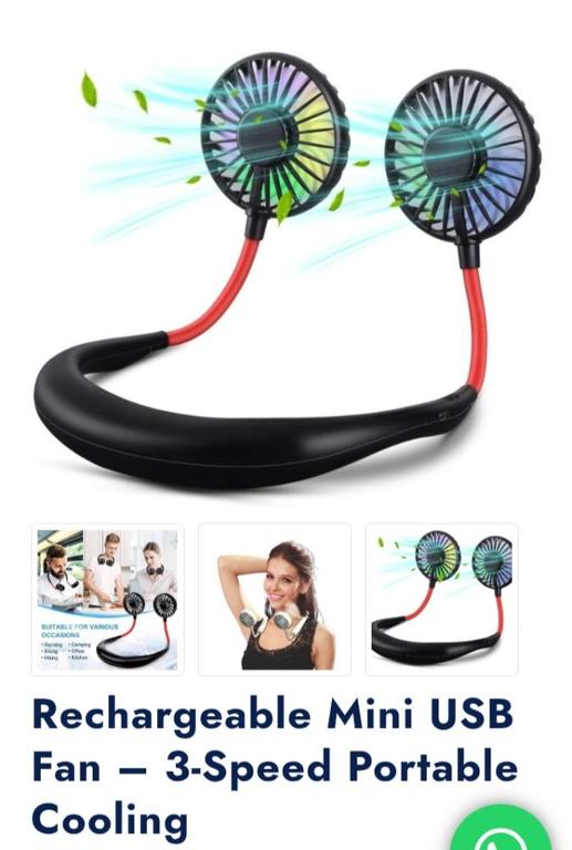 Rechargeable Mini USB Fan is a lightweight and portable cooling solution designed for personal use. It features a dual head design with flexible arms, allowing you to adjust the airflow direction according to your comfort. The fan operates with three adjustable speed modes, providing customized cooling in different environments. Built with a rechargeable battery and USB charging support, it ensures convenience and energy efficiency. Ideal for outdoor activities, office, home, gym, or travel, this mini fan offers hands-free operation by simply wearing it around the neck. Its compact design makes it easy to carry and store while delivering powerful airflow for instant cooling relief.