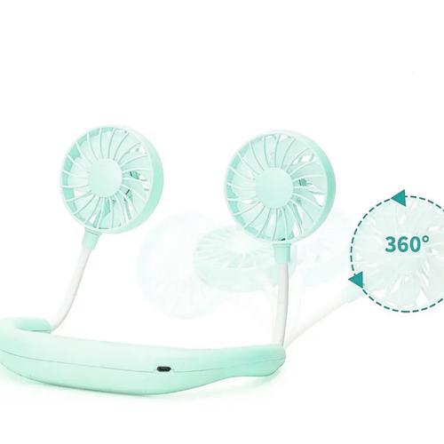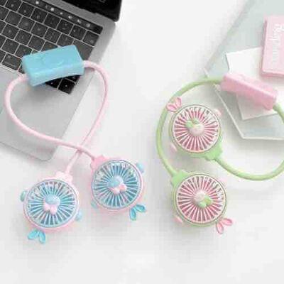 The packaging design of the Neck Desktop USB Fan is light purple and features a playful cartoon illustration of the fan. It is designed with a white and light green color scheme, showcasing two small fan heads attached by a flexible neck strap. Each fan head is adorned with a charming, stylized face.