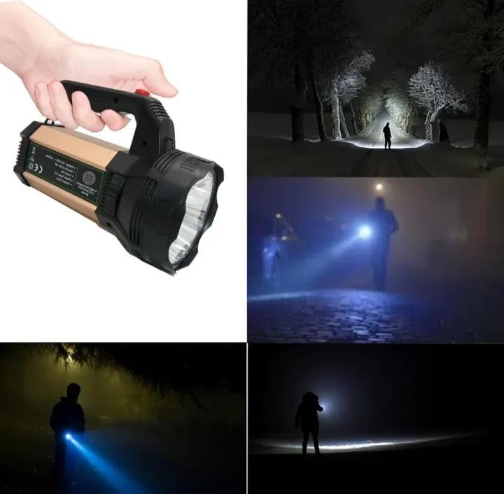 The Rechargeable Searchlight Torch features a powerful LED beam with a maximum range of 800 meters. Its efficient design incorporates three 2000mAh batteries for a total capacity of 6000mAh.