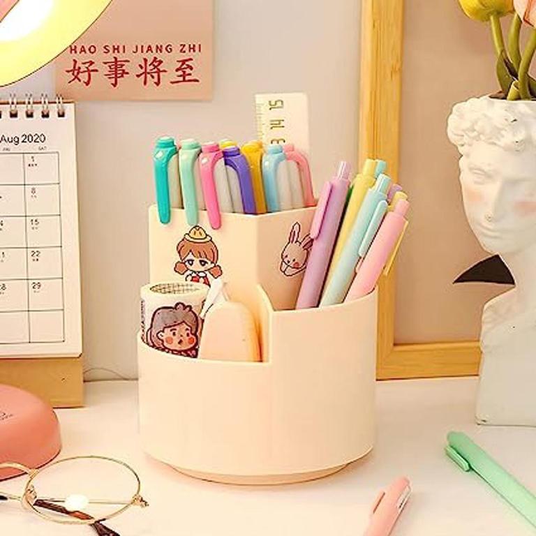 This 360-degree rotating stand features three compartments, providing ample storage for your pens, pencils, and makeup brushes.