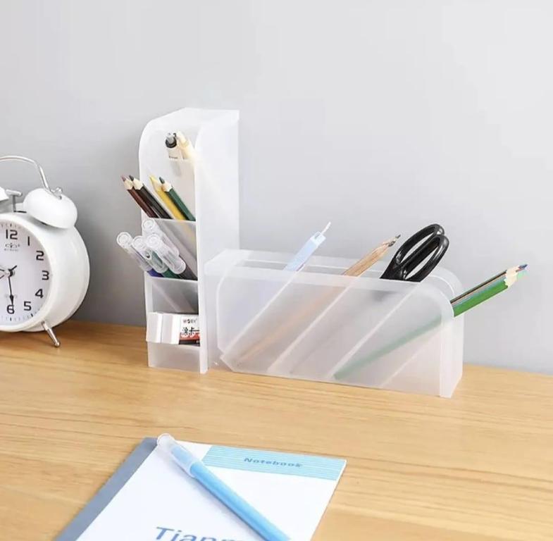 This multi-compartment desktop pen holder serves as an ideal organizer for both home and office environments.
