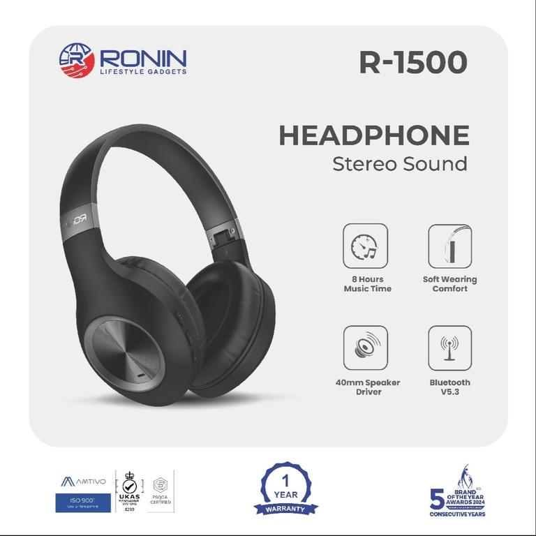 Ronin R-1500 Bluetooth Stereo Headphones with Deep Bass, Foldable Design, and AI Voice Assistant