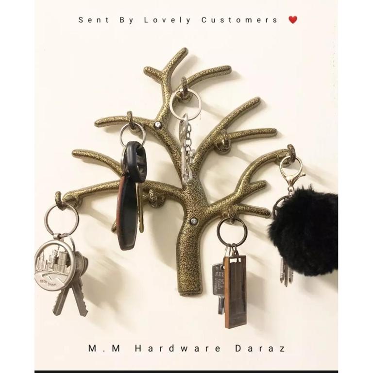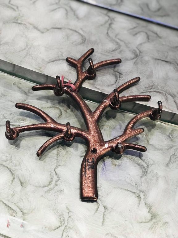 This tree-shaped metallic key holder features an antique design that not only serves a functional purpose but also adds a decorative touch to your wall.