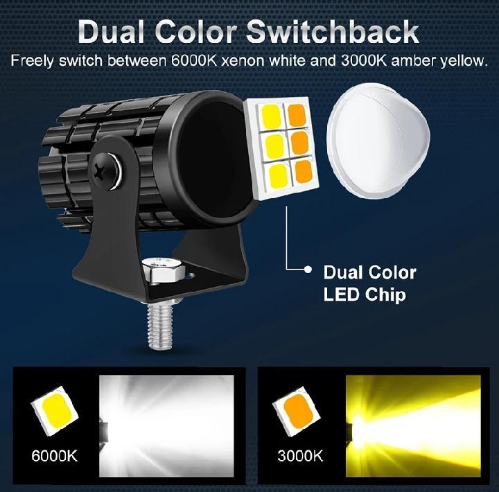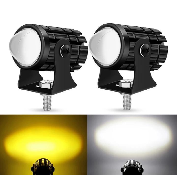 Introducing a new mini LED driving light designed for motorcycles, featuring amber lighting and high/low beam functions. Each light has a power of 20W, totaling 40W for the pair.