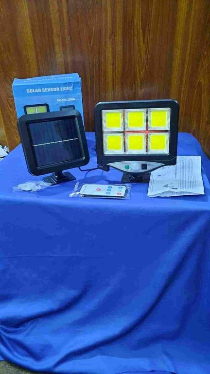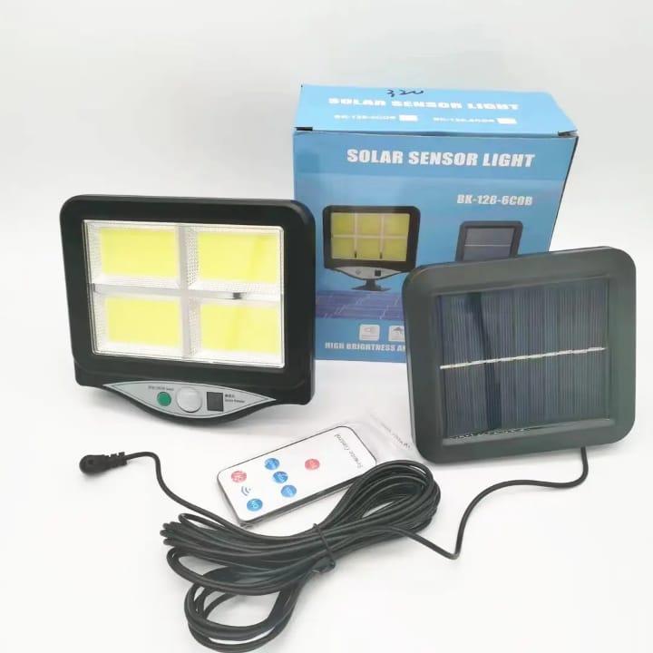 Solar Sensor LED Light featuring 6COB super bright LEDs and an advanced motion detection sensor. Designed with a high-quality solar panel, it automatically charges during the day and lights up at night, saving energy and reducing electricity costs. The remote control function allows you to adjust brightness modes and timing settings conveniently.