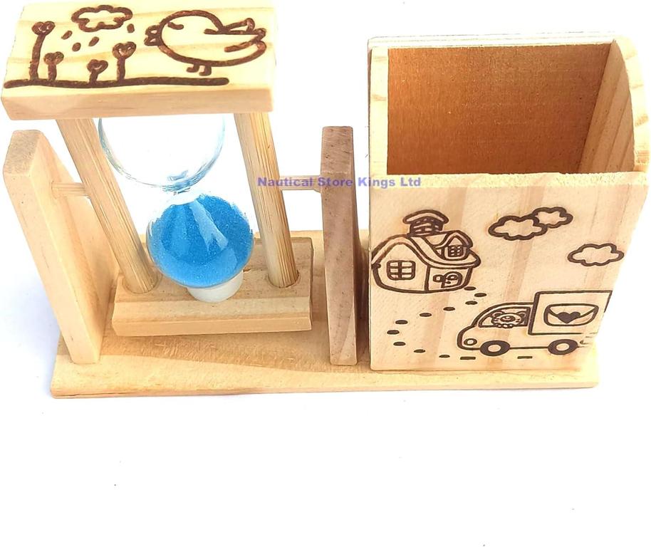 - Unique Design: Handcrafted wooden pen stand with a built-in sand timer for a rustic and functional touch.