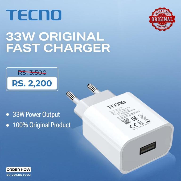 The original TECNO fast charger offers multiple power options (70W, 45W, 33W, and 18W) to ensure quick charging for a wide variety of TECNO smartphones.
