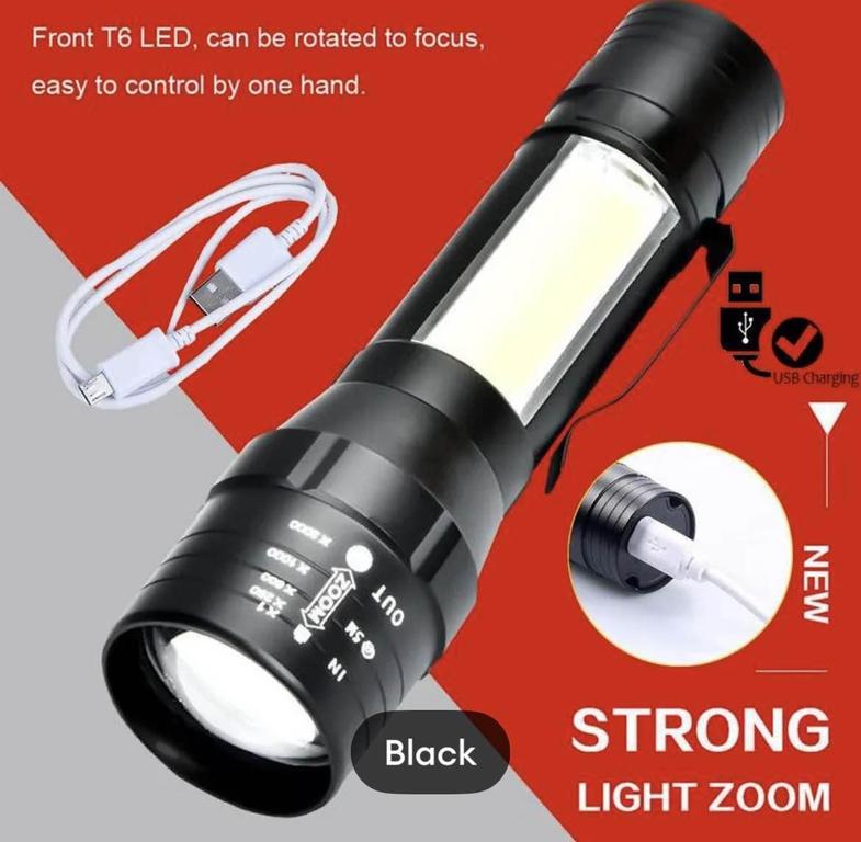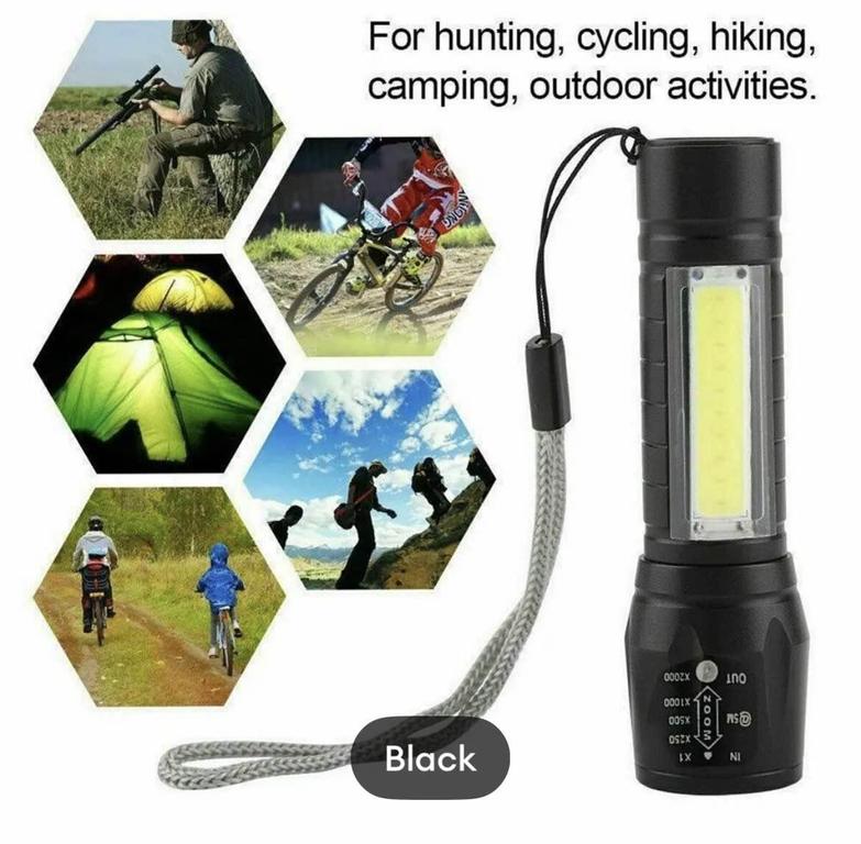 This USB rechargeable LED flashlight is designed for versatility and convenience. Its compact and waterproof design makes it perfect for various outdoor activities, including camping and hiking.