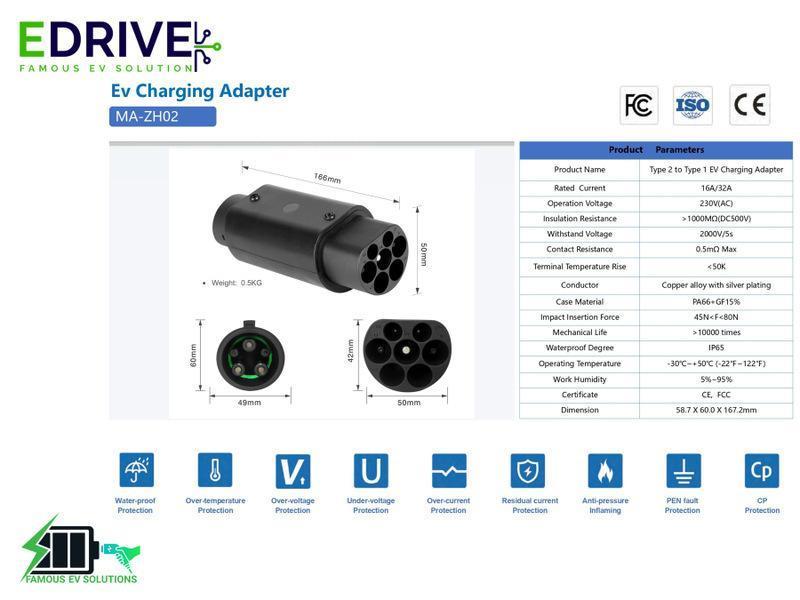 Enhance your charging options with our Type 2 to Type 1 Adapter. This connector allows for seamless compatibility between Type 2 charging stations and Type 1 electric vehicles.