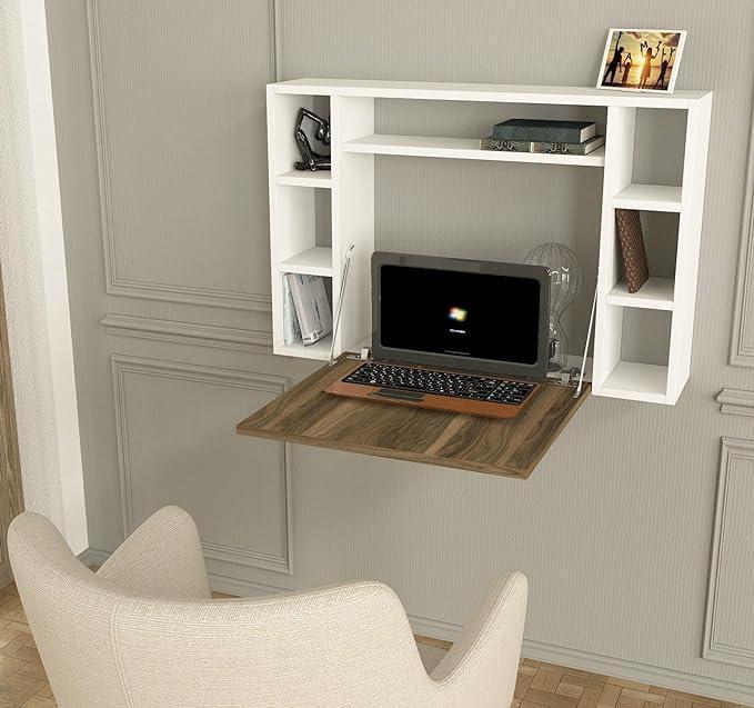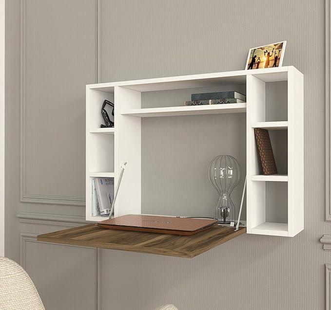 Wall Mounted Study Desk White - Walnut, Foldable Computer Desk, Writing Desk with Hanging Bookcase and Storage Shelves