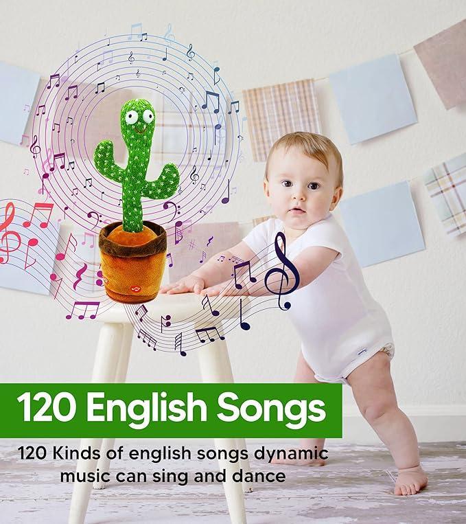 Upgraded Funny Dancing Cactus Repeats What You Say. It will Record, Repeat ,Talk, Glow, Wiggle, Mimick, Dance & Sing .There are 120 songs in many language it can sing. It can record what you say and repeat your words and swing its body with music rhythm. It will twist his body and glows when singing. This cactus toy can repeat your words, and the internally self-contained LED lights make it glowing,and also has a recording function.This dancing cactus toy can't adjust volume