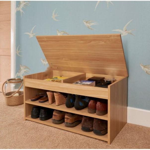 - This wooden flip-top shoe changing bench features a storage compartment with double-layer storage boards for added convenience.