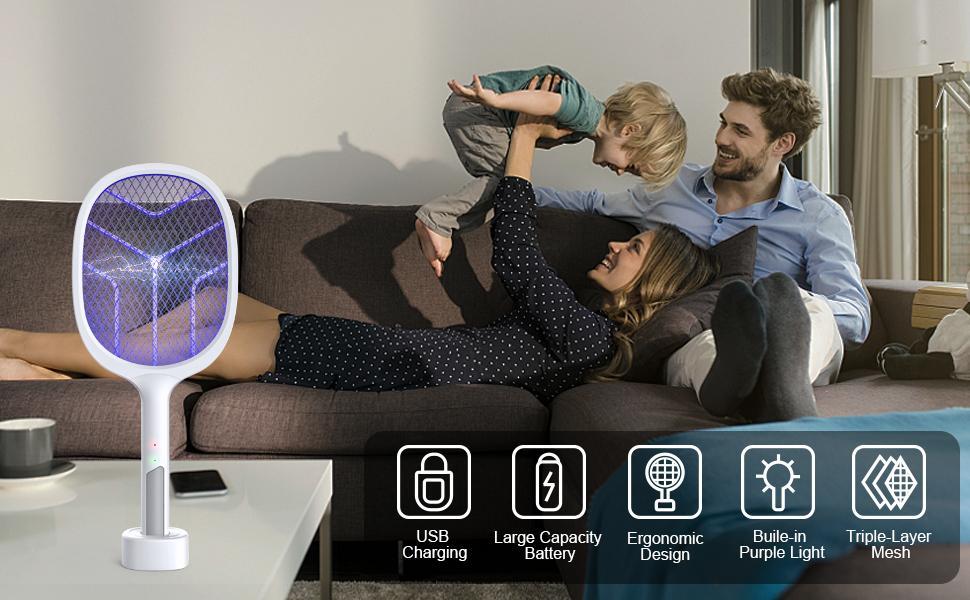 - ELECTRIC TRAP LAMP: Simply place the mosquito racket on the base and activate it. Mosquitoes will be destroyed if they fly toward the purple light